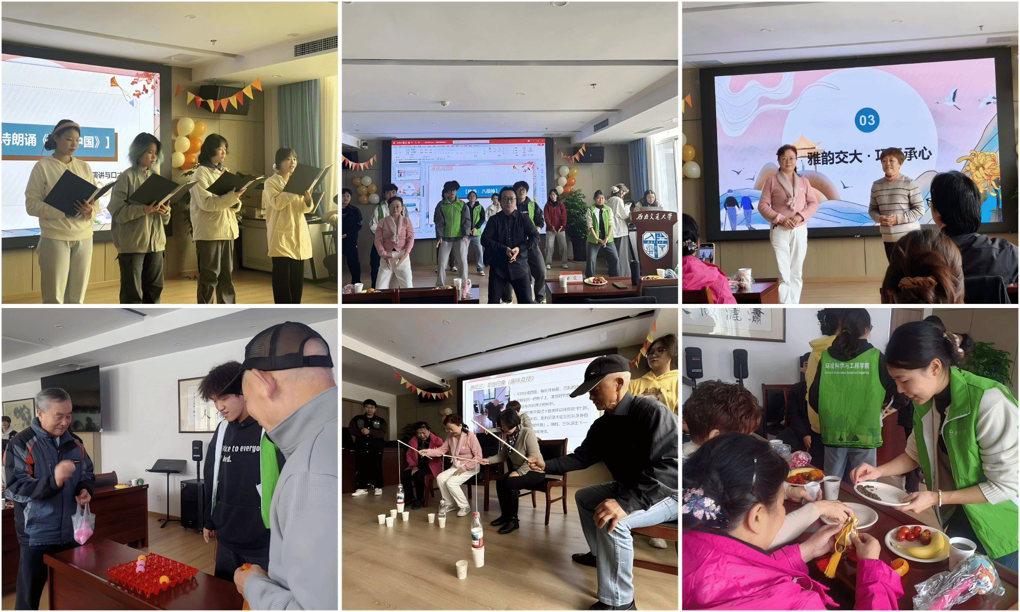 青年志愿者协会承办的第二期“爱在秋日,暖阳融融”敬老月主题活动在犀浦校区老年活动中心顺利开展。通过文艺演出、互动游戏、传统手作等形式,为退休老教师送上诚挚祝福与青春陪伴,弘扬尊师重道传统,传承交大精神。