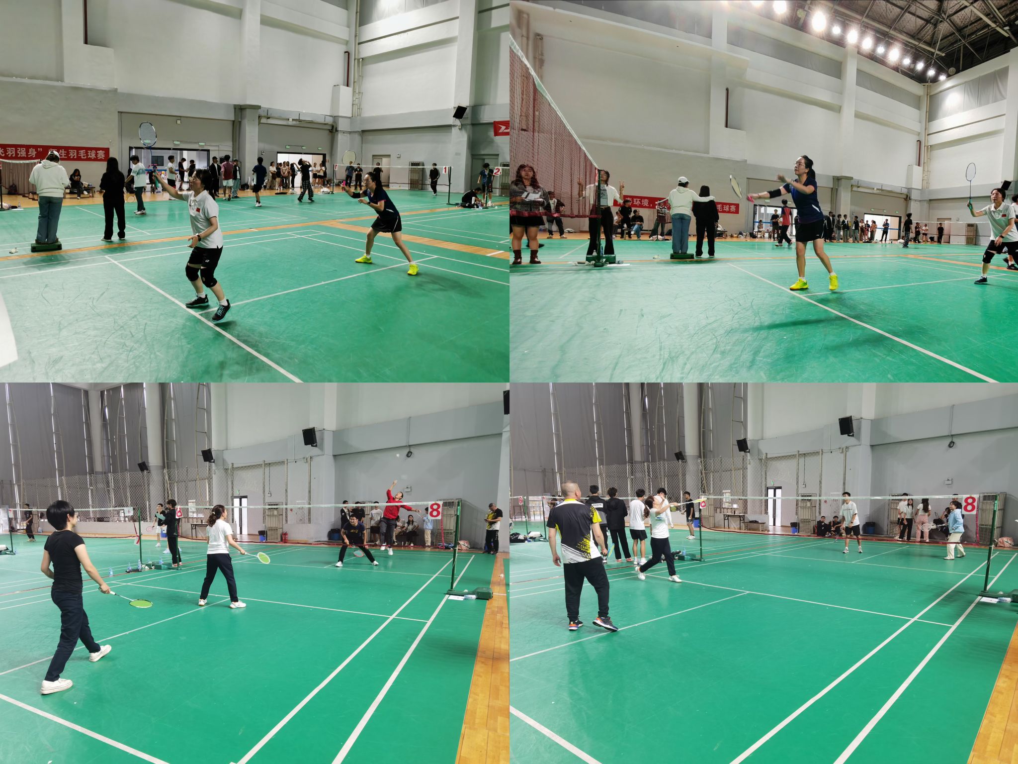 比赛当天,体育馆内气氛热烈,师生们早早来到场地热身,准备迎接即将到来的挑战。本次比赛分别设立了男女单打、双打,混双五个项目,龚正君带领教师队与学生队开展了激烈的友谊赛,大家元气满满、劲头十足,沉浸式参与比赛。双打比赛,队友间默契配合的同时互相鼓励,快速移动,大力扣球,整个过程让人热血沸腾、酣畅淋漓!最终决出各项目的冠、亚、季军。