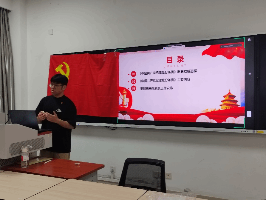 为认真贯彻落实党中央和上级党委关于开展党纪学习教育的工作部署,进一步增强党员干部纪律意识,提高党性修养,强化政治担当,2024年5月16日19:30,研22级环境第二党支部于X4127教室开展主题党日活动,围绕新修订的《中国共产党纪律处分条例》(以下简称《条例》),专题学习党的工作纪律、生活纪律。会议由支部书记邱建宏主持。